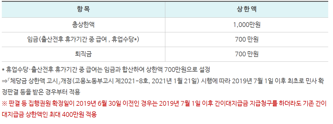 - 임금, 휴업수당, 출산전후 휴가기간 중 급여와 퇴직금은 각 항목별 상한액 700만원