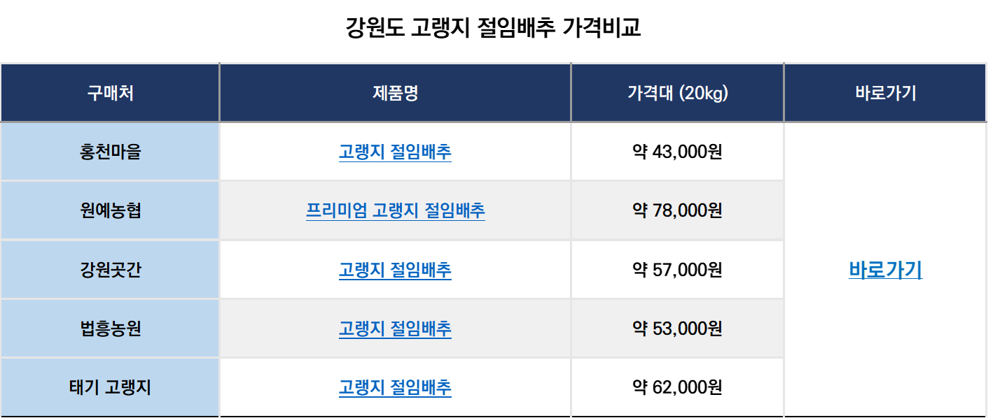 각 판매처는 다양한 상품 구성을 제공하며, 절임배추와 함께 김장 재료들을 구매할 수 있는 장점이 있습니다. 아래에서 주요 판매처의 절임배추 정보를 확인하세요!