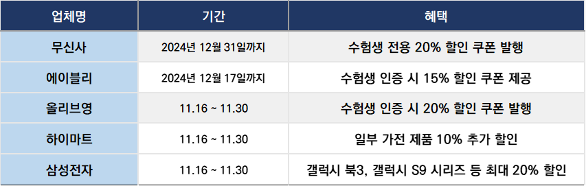 - 올리브영: 11월 16일 ~ 11월 30일, 수험생 인증 시 20% 할인 쿠폰 제공
