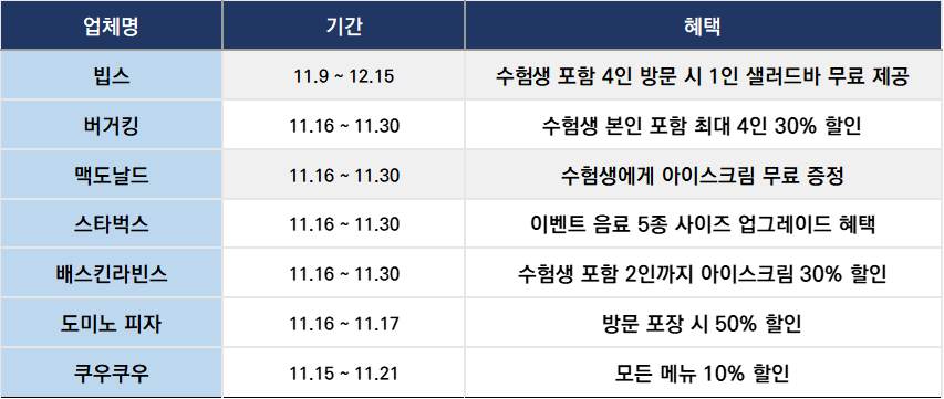 - 버거킹: 11월 16일 ~ 11월 30일, 수험생 포함 최대 4인 30% 할인