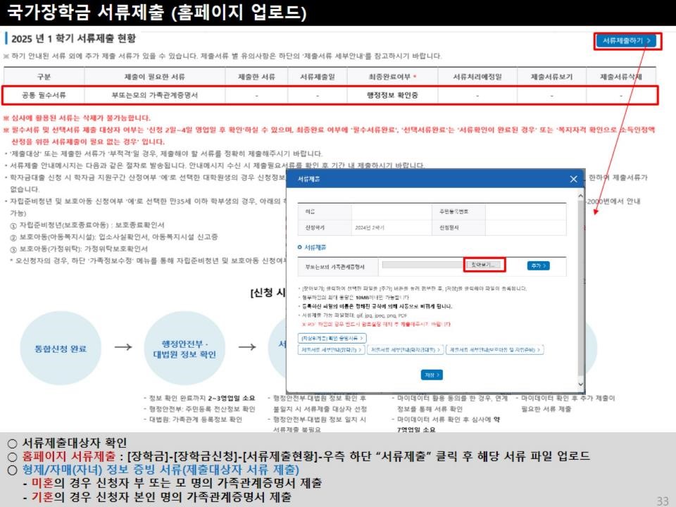- 장학재단에서 요구하는 서류를 준비하여 업로드합니다. 서류는 신청 완료 후에도 [서류 제출] 메뉴에서 추가로 제출할 수 있습니다.