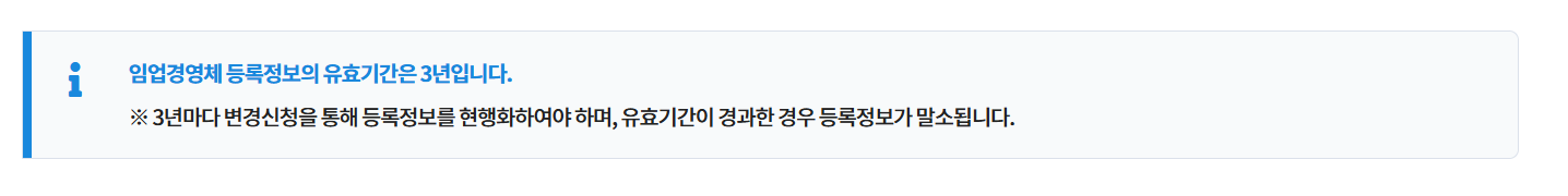 임업경영체 등록정보의 유효기간은 3년입니다. 등록 후 3년이 지나면, 변경사항을 반영하여 갱신 신청을 해야 하며, 갱신하지 않으면 등록정보가 말소됩니다. 따라서 3년마다 갱신 절차를 챙기셔야 합니다.