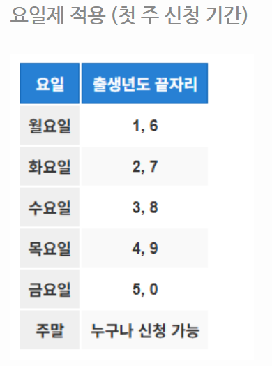 💡 중요! 신청 첫 주는 출생 연도 끝자리에 따라 요일별로 신청이 가능하지만, 다음 주부터는 요일 구분 없이 모두 신청이 가능합니다.