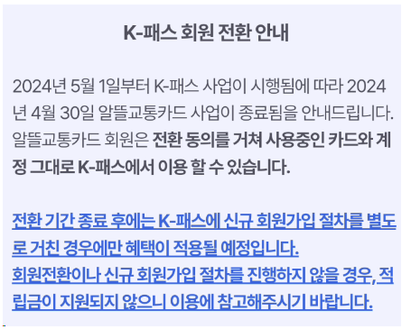 ✅ 전환기간이 종료된 후에는 k-패스에 신규 회원가입 절차를 하셔야만 혜택을 적용받을 수 있습니다.