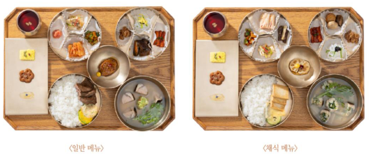 배추김치·명란젓·김부각·대하잣즙채 오이송송이·황태구이·탕평채·우육숙편 표고석류탕 진지·표고버섯구이·떡갈비·새송이 전·호박전 전복초 (꽃별찬) 후식 증편·모약과·오미자차