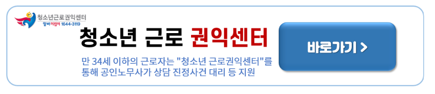 👉🏻 만약에 만 34세 이하의 경우 아래 "청소년 근로권익센터"를 통해 공인노무사가 임금체불에 대한 상담 및 신고까지 대리로 진행해 드립니다. 혼자서 어려워하지 마시고 도움 받아 보시길 바랍니다.