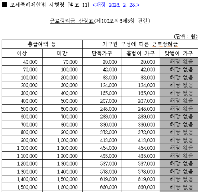 | 홑벌이가구 | 가 | 700만원 미만 | 총급여액 등 x 700분의 285 |