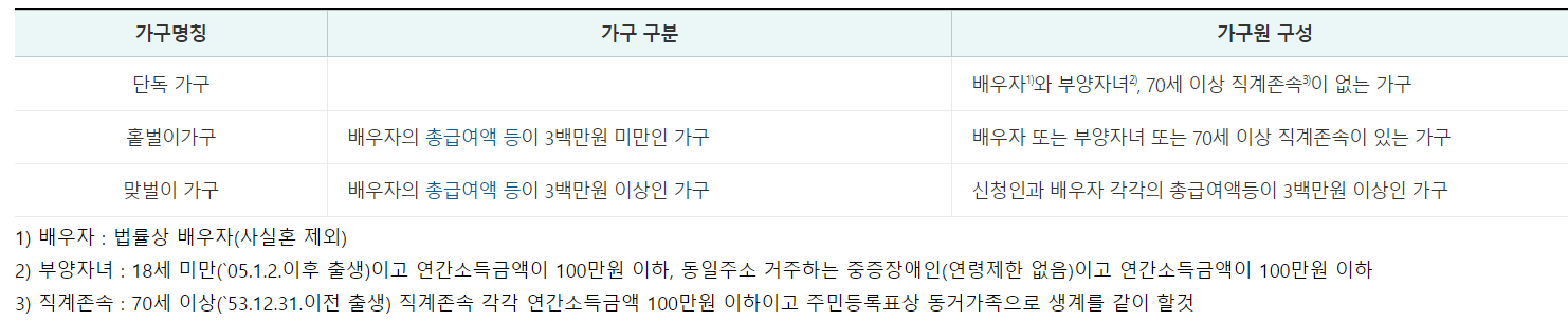 - 맞벌이가구: 배우자의 총 급여액 등이 300만 원 이상인 가구로, 신청인과 배우자 각각의 총 급여액 등이 300만 원 이상인 가구