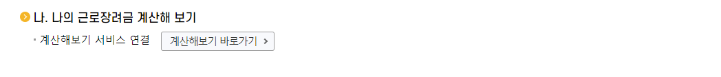 메뉴 : 근로장려금/연말정산/전자기부금 > 근로, 자녀장려금 정기신청 > 계산해 보기 클릭