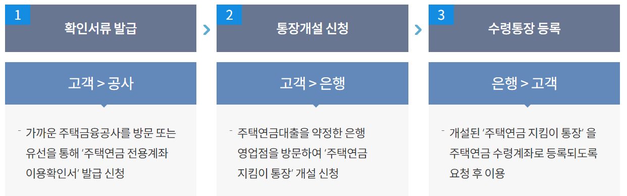 개설된 ‘주택연금 지킴이 통장’을 주택연금 수령계좌로 등록 요청 후 이용합니다.
