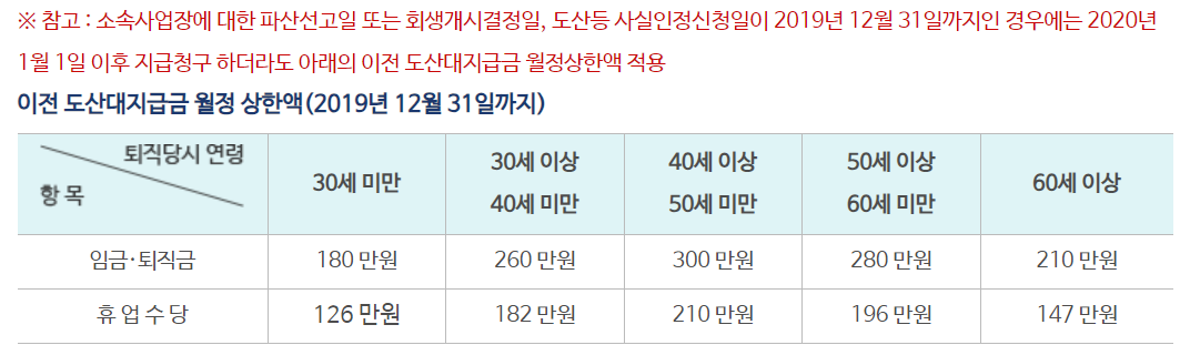 • 도산대지급금 상한액은 법원의 파산선고일, 회생개시결정일, 또는 도산 등 사실인정 신청일이 2021년 1월 21일 이후인 경우부터 적용됩니다.