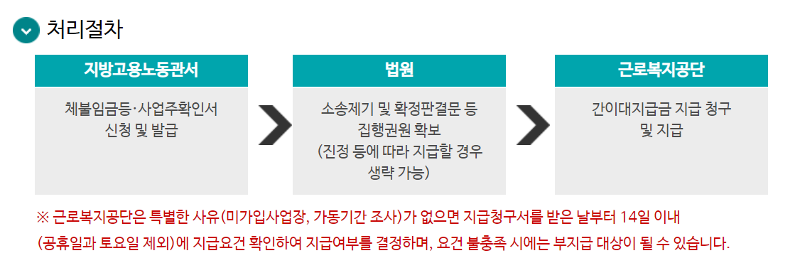 - 근로복지공단: 간이대지급금 지급 청구 및 지급 (청구서 접수 후 14일 이내 처리)